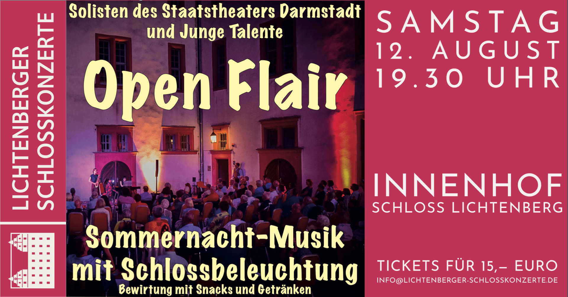 Die prächtige Renaissance-Fassade in buntem Licht, die sanften Hügel des Odenwalds bei Sonnenuntergang sind die Kulisse für ein unvergessliches Konzerterlebnis.
